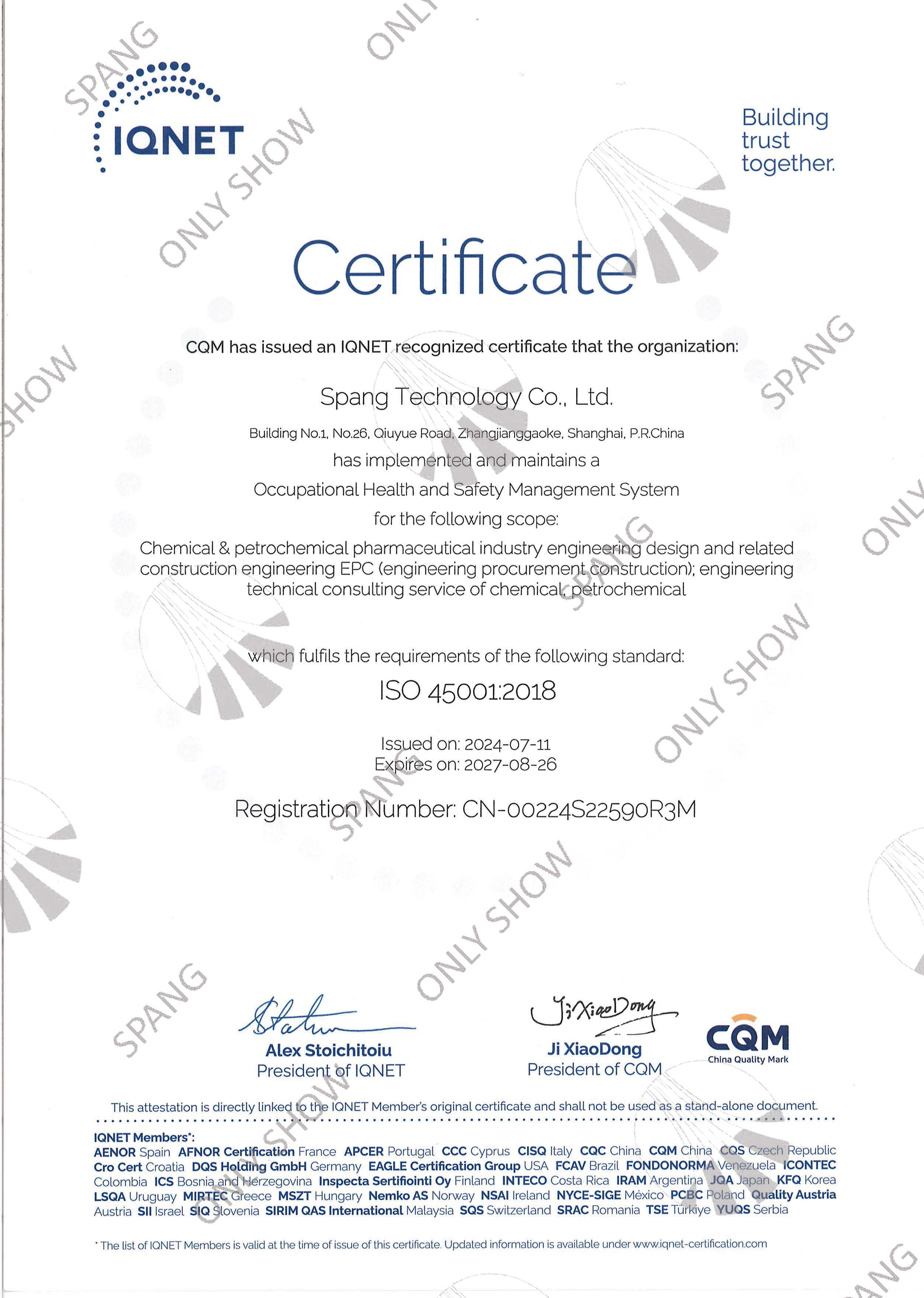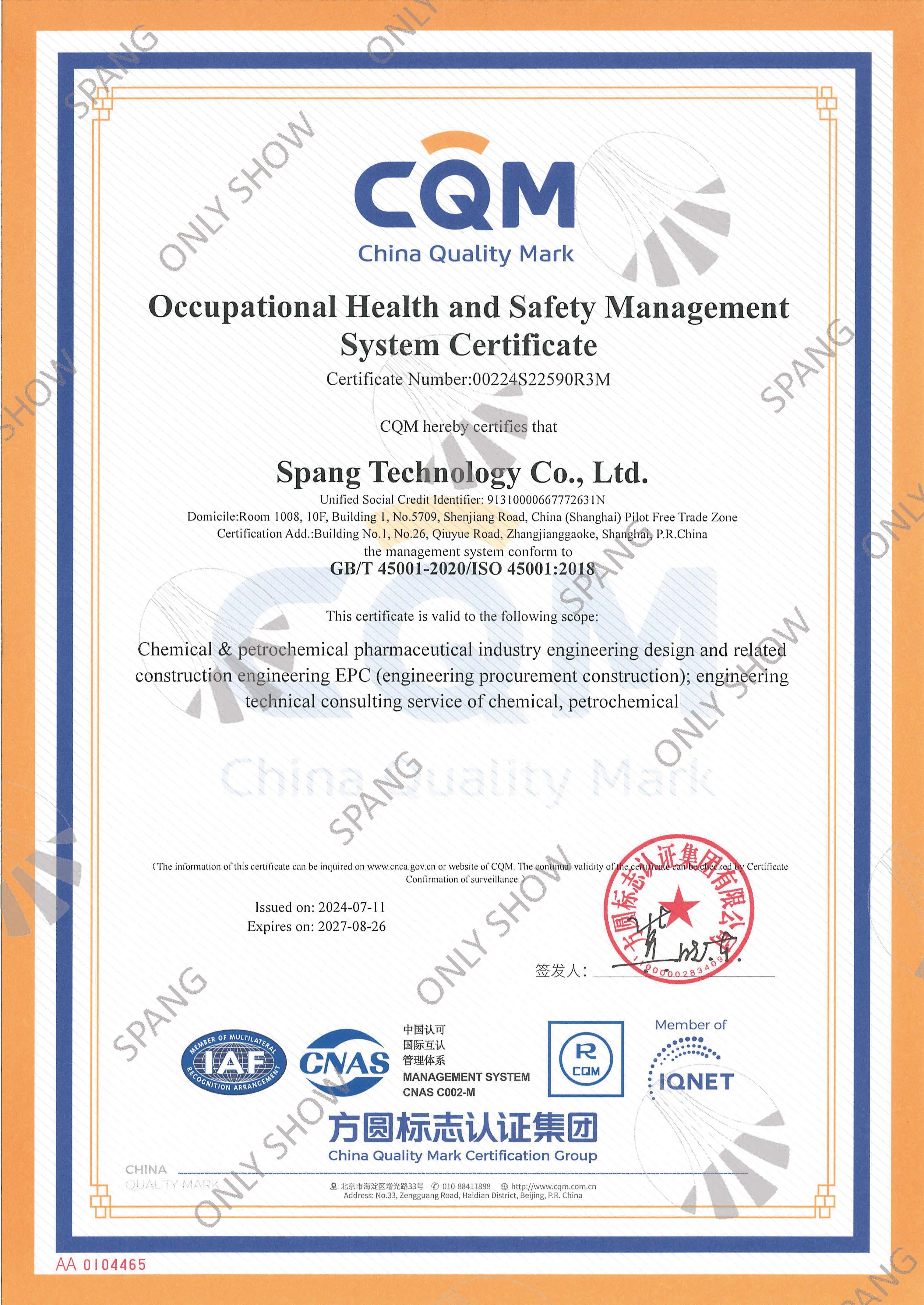 职业健康安全管理体系证书(英文版)-国际通用