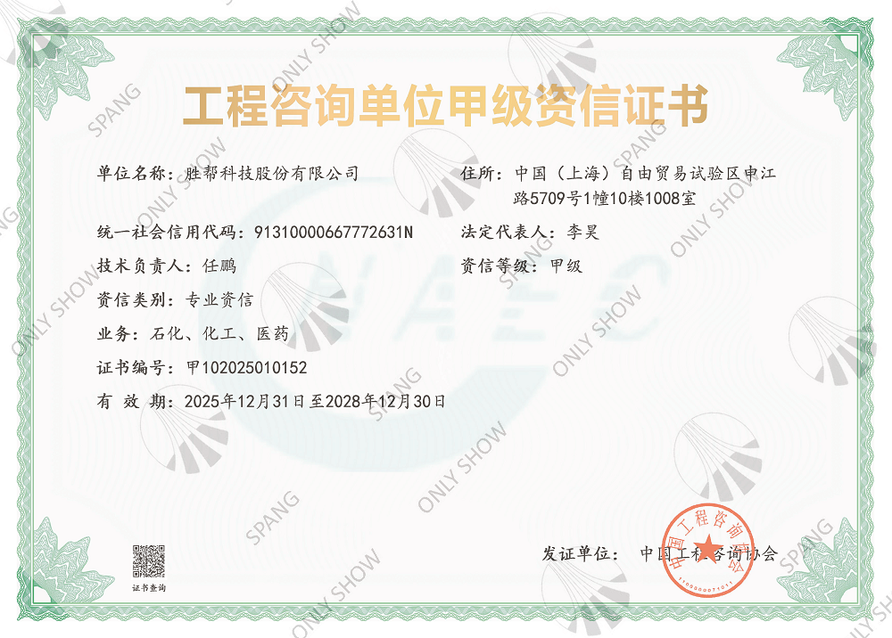工程设计资质证书(化工石化医药行业(化工工程)专业甲级)