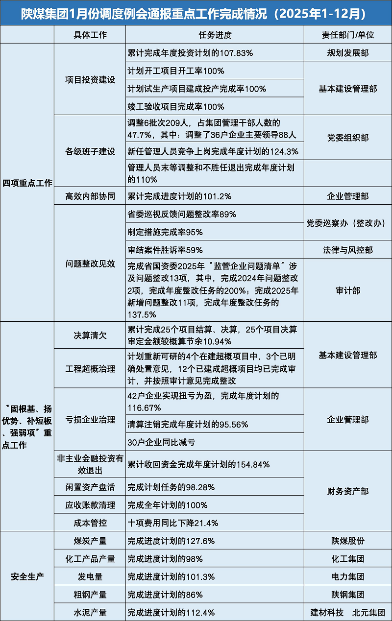 会议总结12月份及2025年重点工作任务完成情况,分析当前工作存在的问题和不足,安排部署近期重点工作;相关职能部门分别汇报了项目投资建设、高效协同发展、各级班子建设、问题整改及安全环保、生产经营、闲置资产盘活、亏损企业治理等重点工作推进情况。